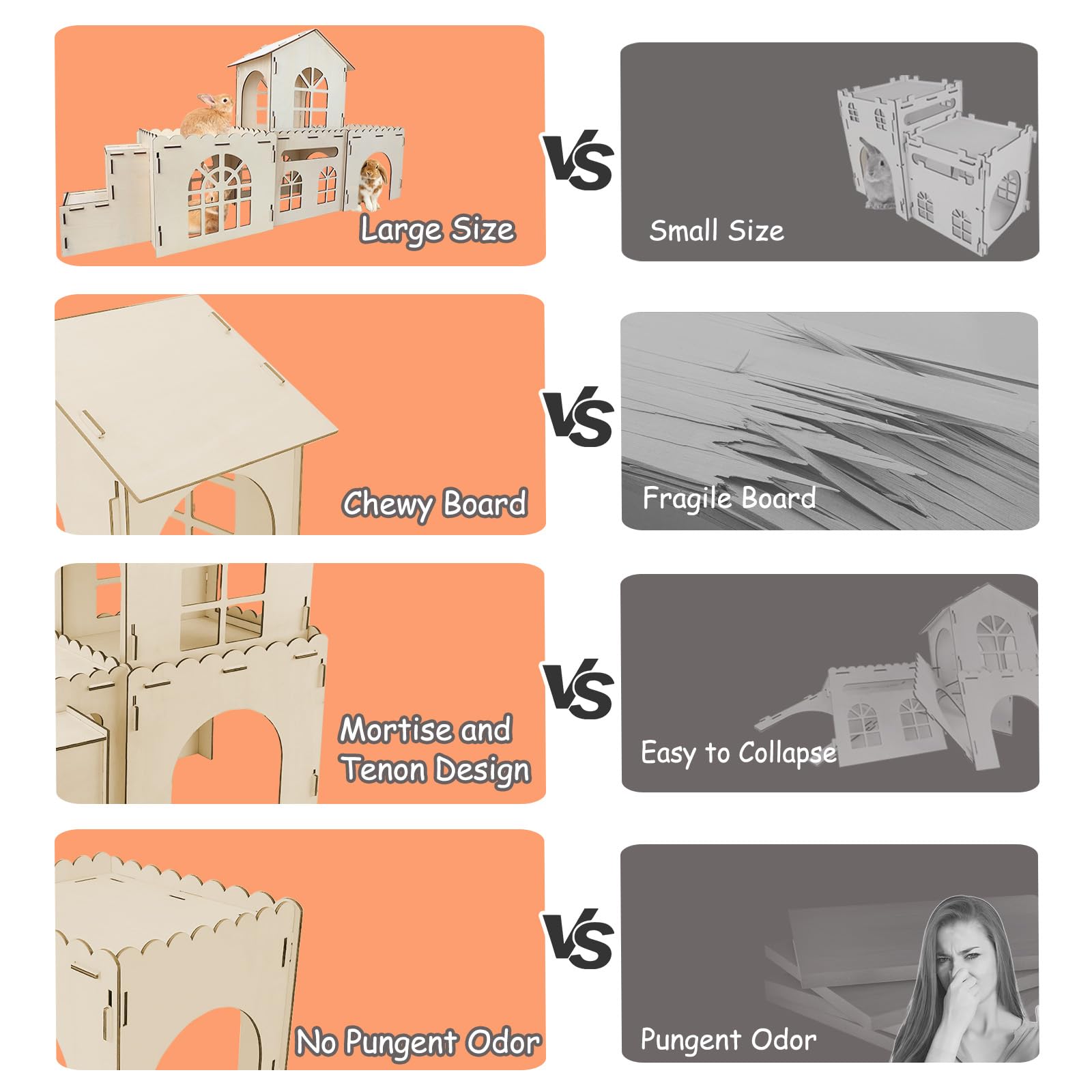 Safe premium material: The rabbit wood house is made of high-quality double clear plywood, which is pet friendly; The connection has been polished to be smooth without burrs, and its top has a smooth wave design,eqquiped with rubber rings; It is designed with windows, arched doors, and stairs, providing good ventilation and a refreshing environment for pets, adding some interesting visual experiences, easier to attract bunny's attention and stimulate their curiosity, reducing boredom