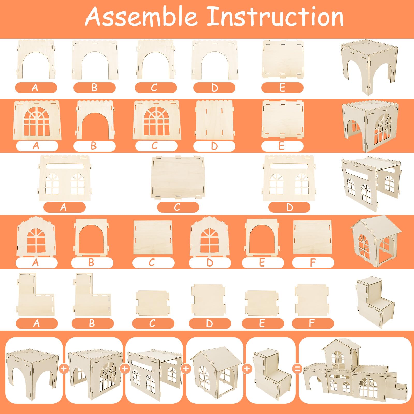 Easy to install: Our castle is nail free installation; The wooden bunny hideaway consists of 25pcs wooden boards and 34pcs rubber bands totally; Each package comes with a detailed instruction manual, which includes an installation tutorial for the 4 independent bunny hideouts on one side and the assembly process for the large castle on the back, making your installation easier