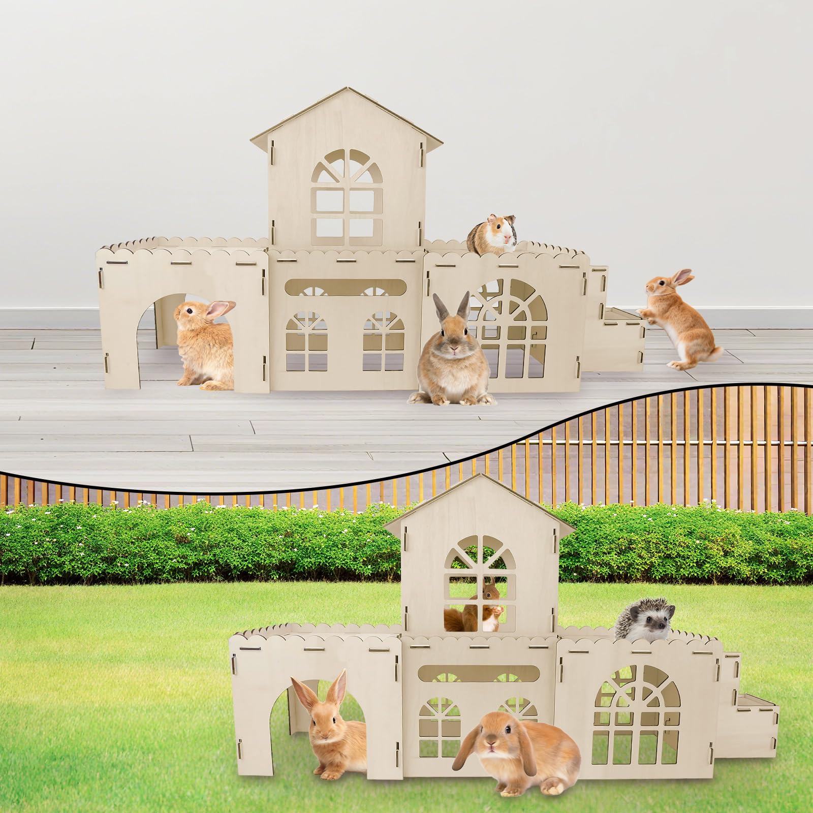 YUEPET Extra Large Wooden Bunny Castle, Ventilated Rabbit Castle Hideaway with Stairs, Detachable Small Animal Hideout & Habitats for Indoor Outdoor Dwarf Rabbits Bunnies to Hide & Play