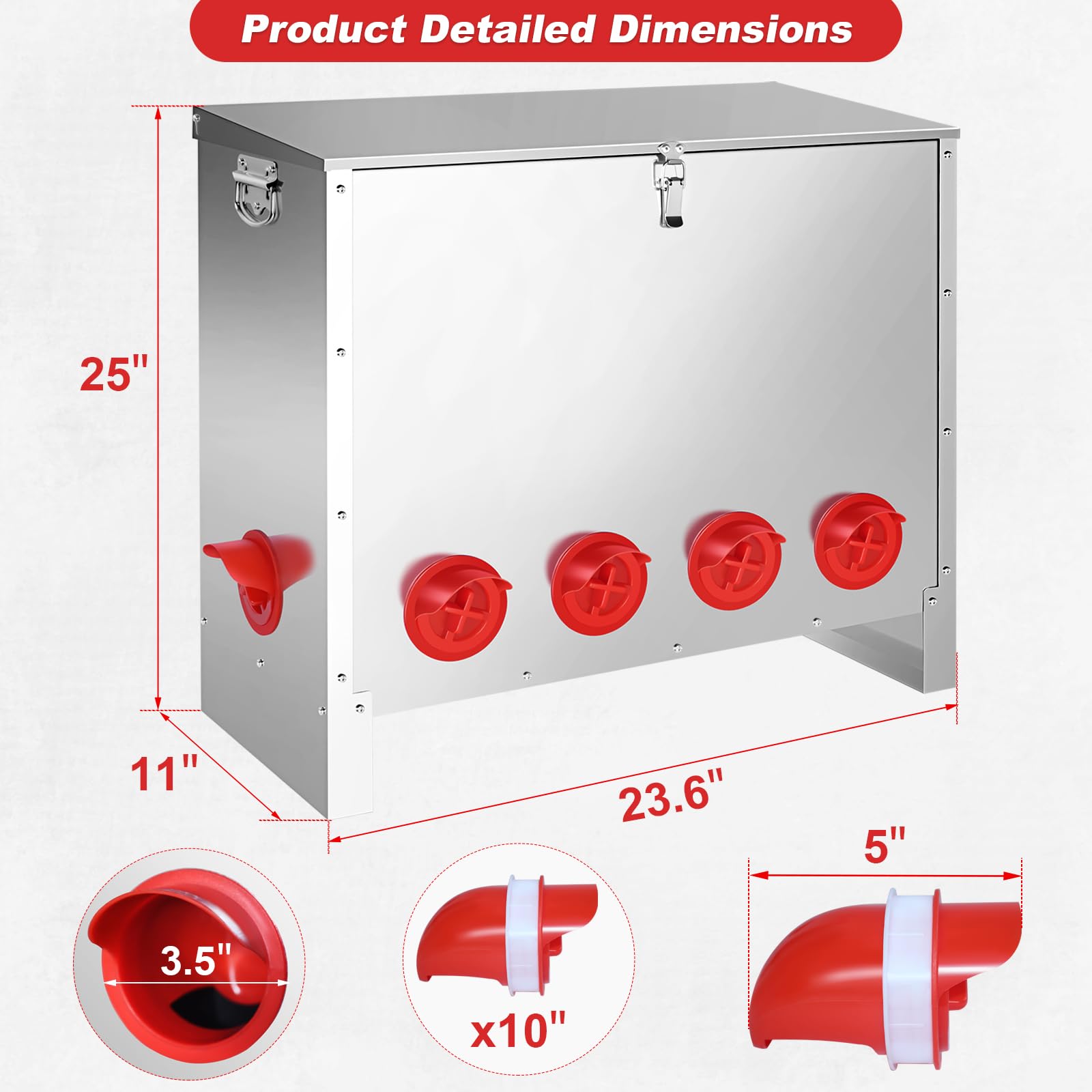 Large Size and Capacity: With dimensions of 23.6" x 11" x 25" and a capacity of 85 lbs, this chicken feeder trough provides ample space to hold up to 10 ports, reducing the frequency of refills and ensuring chicken have a steady supply of feed over time