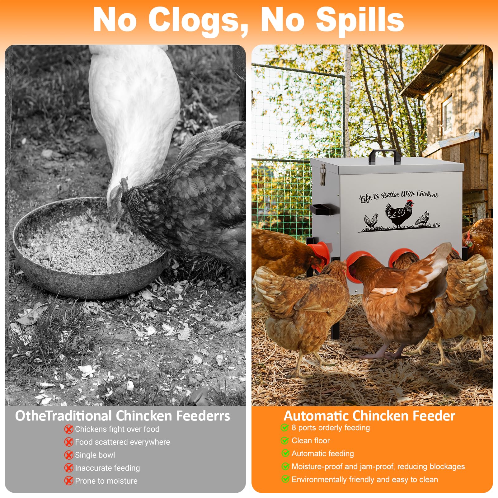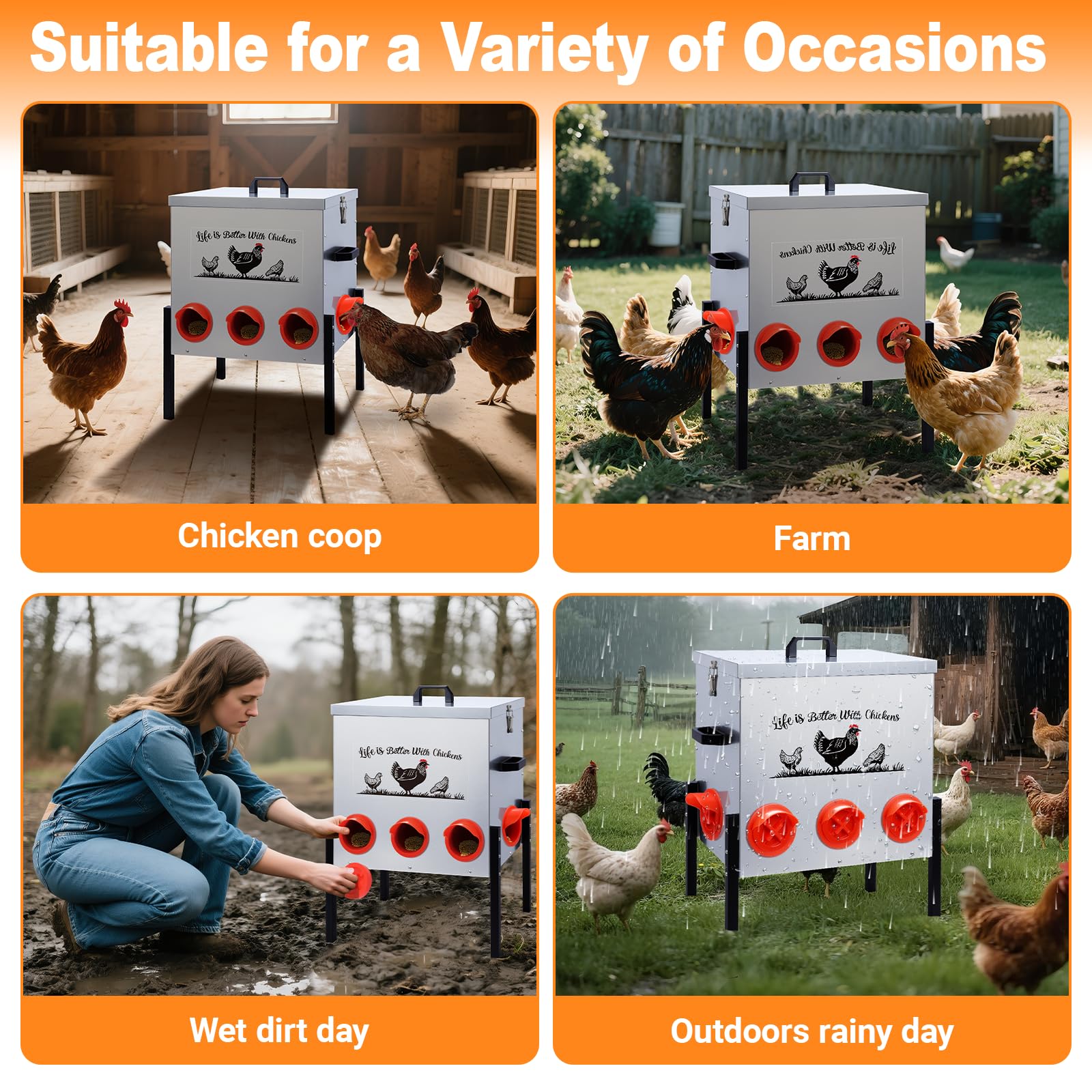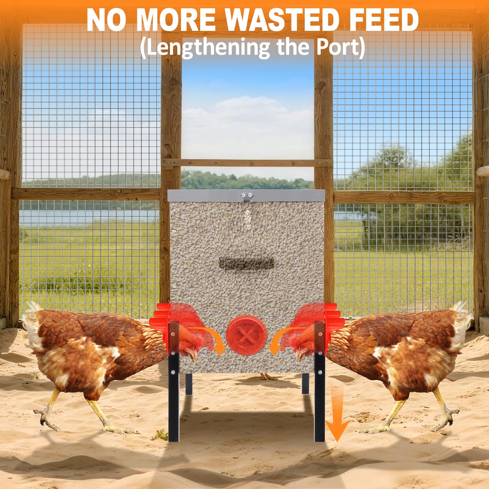 Large Capacity Chicken Feeder:This automatic chicken feeder keep your poultry well-fed with minimal effort using our heavy-duty 50 lb capacity feeder,perfect for chickens, ducks, geese, and more. Designed for large flocks, it reduces the need for frequent refills, saving you time and ensuring your birds always have fresh, dry feed.
