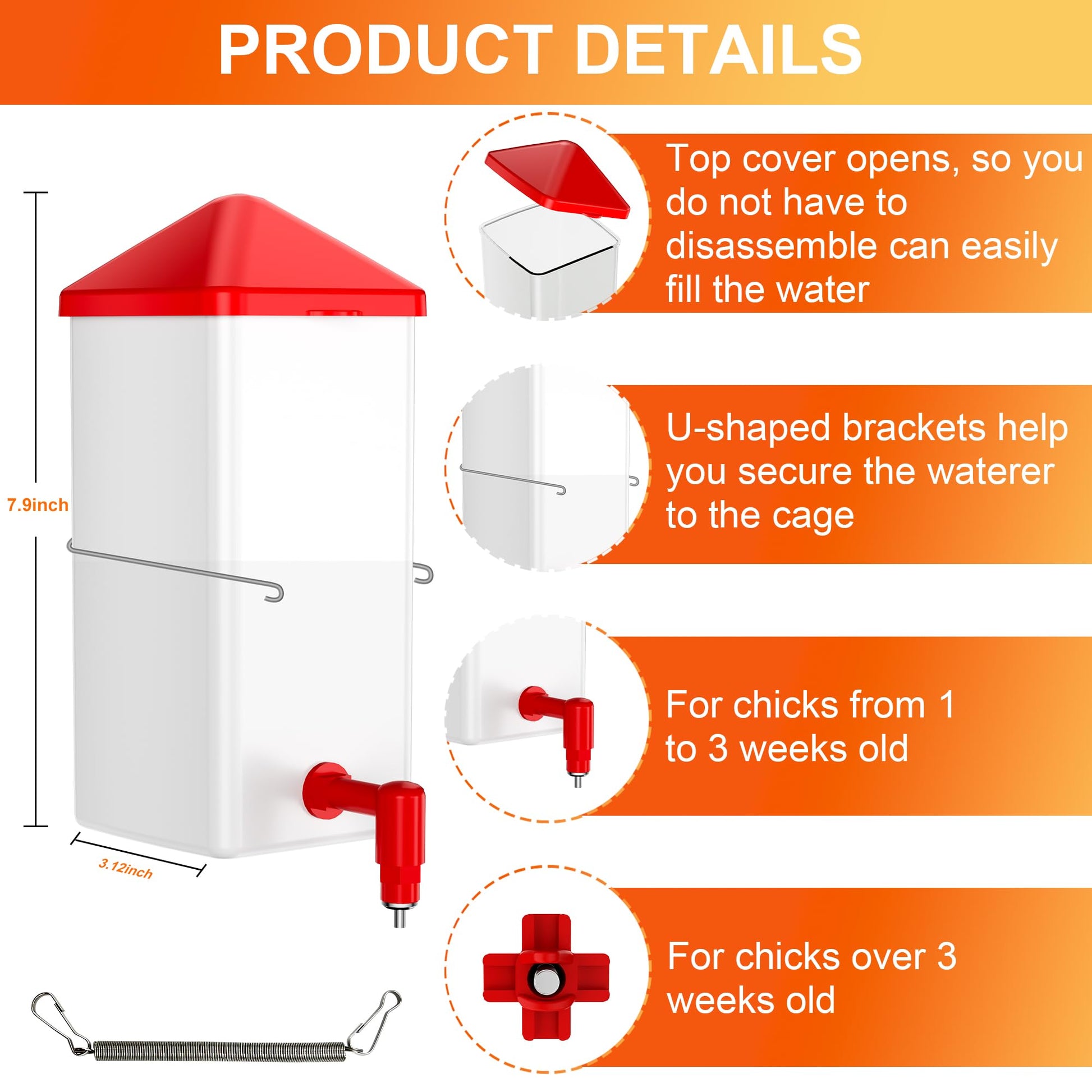 THE PERFECT STARTER KIT: Our waterer is designed with a red trigger that will attract your chicks to peck at it. Just a light touch will bring water out, which will quickly familiarize your chick with drinking water, and we also have a red horizontal nipple. You can choose different drinking methods as the chick grows
