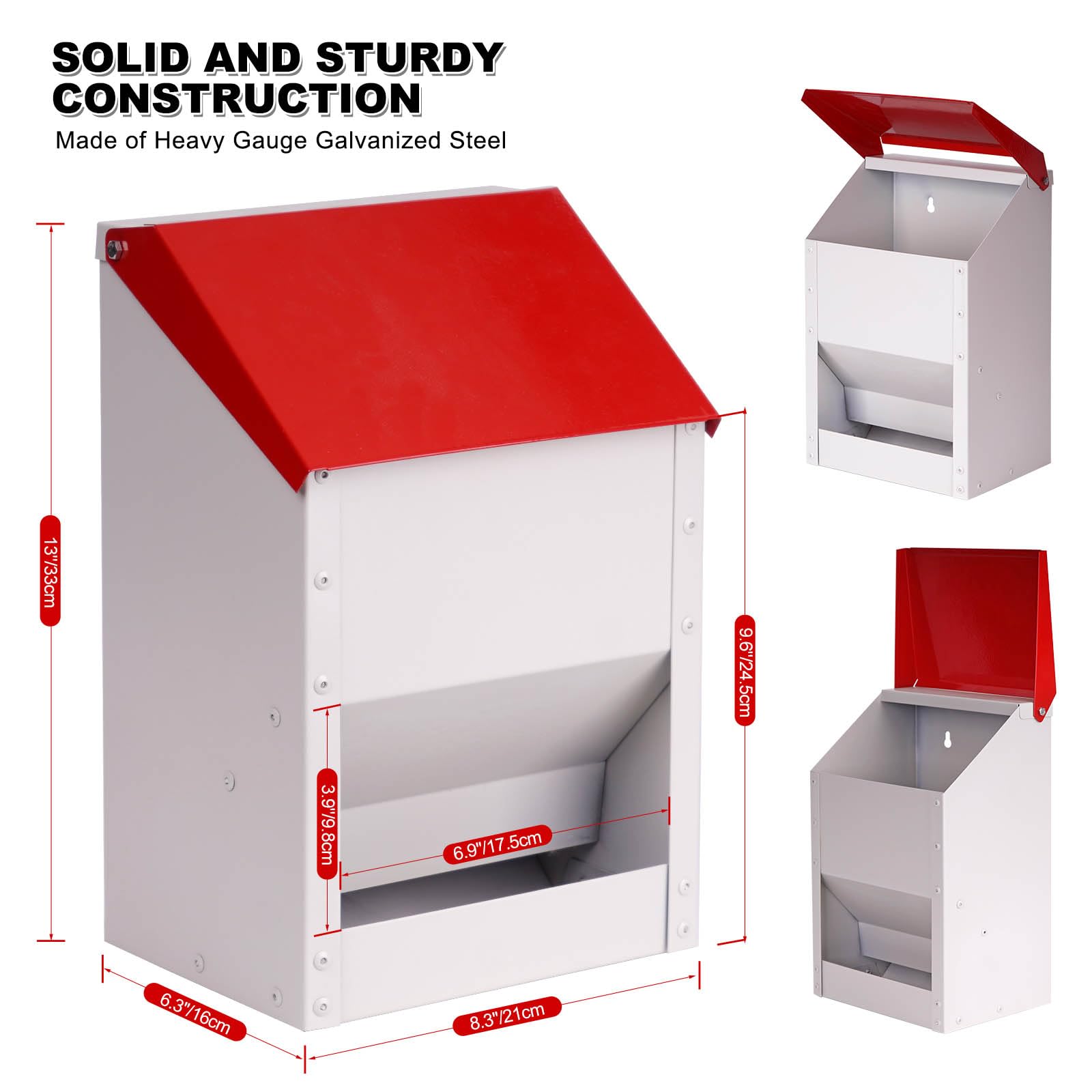 SOLID CONSTRUCTION METAL CHICKEN FEEDERS: This chicken feeder with lid is made of heavy gauge galvanized steel, very sturdy and strongly built, can last a long time, making it perfect for outdoor use;