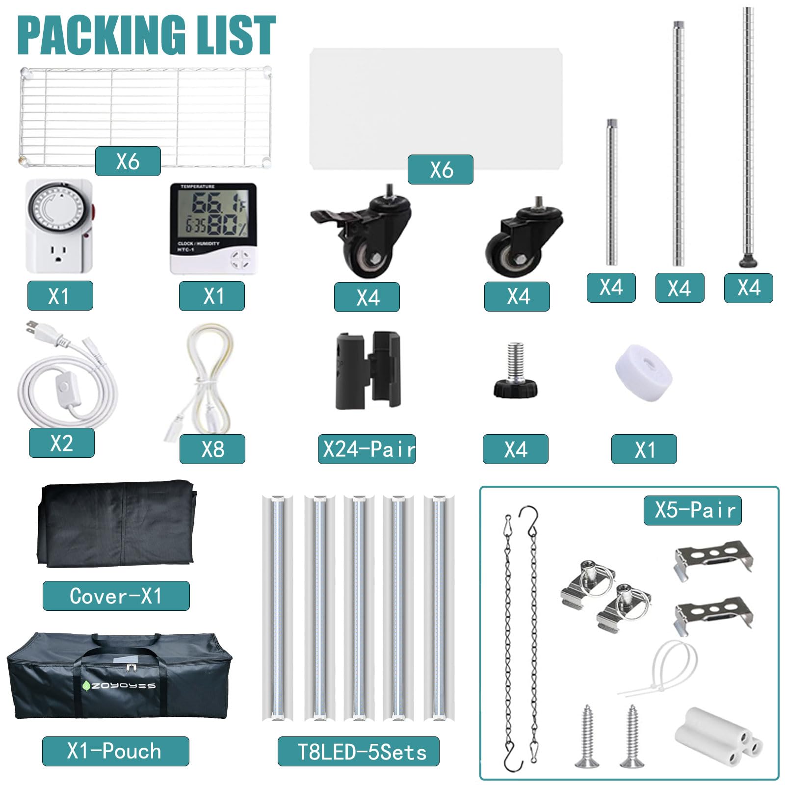 6. The growth bracket includes: ZOYOYES metal plant long bracket kit x1, T8 growth lamp kit x1, fully enclosed growth tent x1, hook and loop tape x1, mechanical timer x1, temperature and humidity meter x1, installation manual x1.